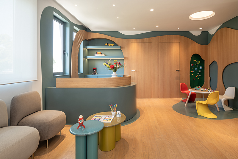 A three-storey building accommodates a unified complex of two medical practices -a gynecology and a pediatric clinic. As part of the 2024 architectural study, iy SYNAPSIS ARCHITECTS developed a shared spatial narrative connecting women, pregnancy, and childhood. Curved lines, natural materials, and earthy tones, combined with a distinctive intervention at the entrance, shape the building’s identity.